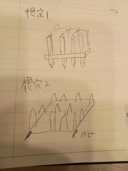 また、いちいち15センチ間隔について確認しながら作業するのもめんどうくさいなと去年学習してから一年、ずっとニンニク用の穴を掘る装置について構想を練ってきました。