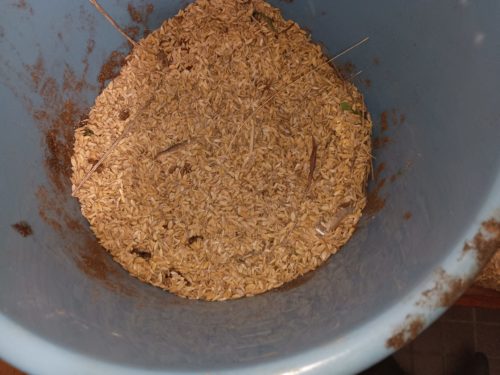 木くずがよかったのですが、とりあえず保温効果がありそうなもみ殻を入れております。